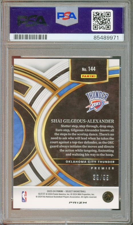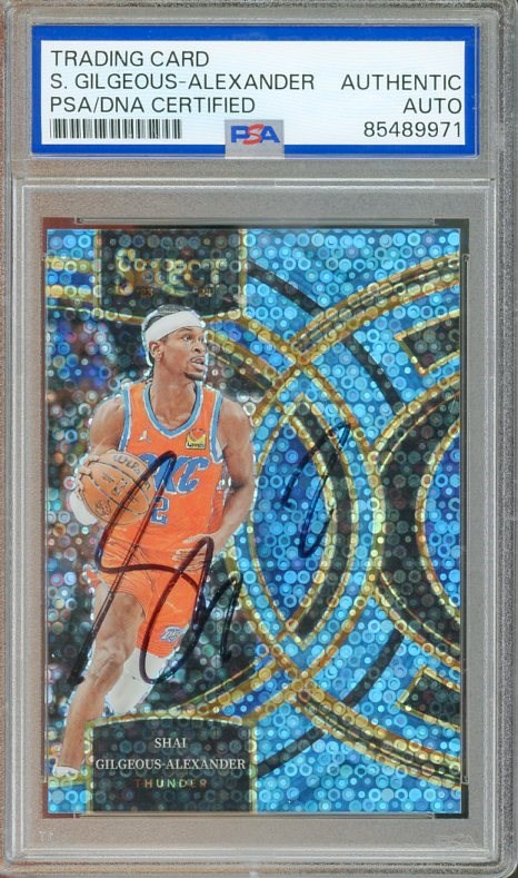 2023 Panini Select Shai Gilgeous-Alexander Blue Disco Prizm #144 Autographed PSA/DNA Authentic - Signed in black sharpie on a card that is serial numbered out of just 99 made. A great looking item!