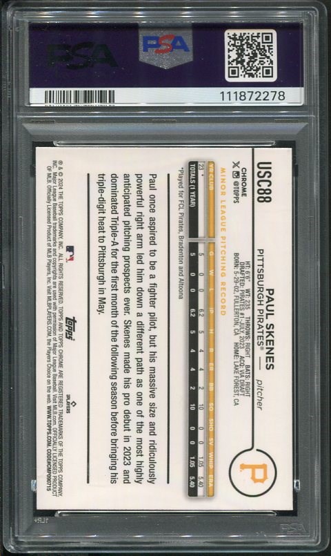 2024 Topps Chrome Update Paul Skenes X-fractor RC #USC88 PSA Gem Mint 10 - One of today’s most dominant pitchers. A Gem Mint card in a scratch free PSA holder.
