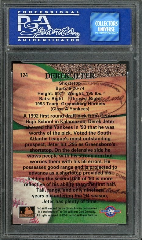 1994 Ted Williams Company Derek Jeter #124 PSA Gem Mint 10 - Offered is an early Jeter card, not often seen, that most Jeter collectors don't have in their collection. Here is a chance to add it to yours.