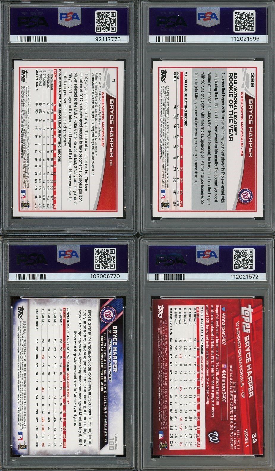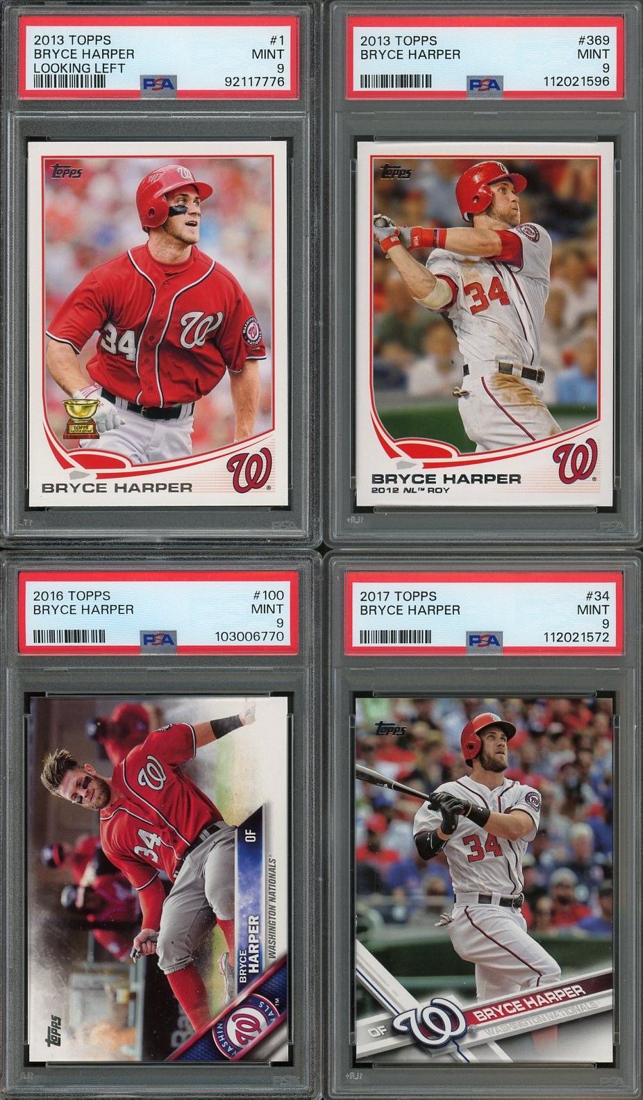 Bryce Harper Lot of 2013 Topps #1, 2013 Topps #369, 2016 Topps #100 and 2017 Topps #34 all PSA Mint 9's - Cards come in clean, problem free PSA?holders