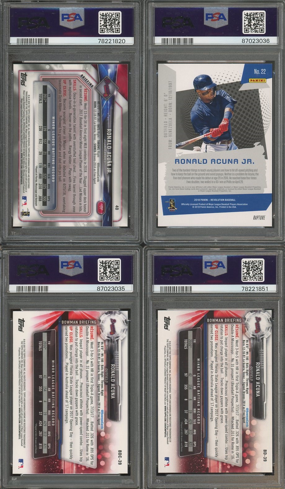 Ronald Acuna, Jr. 2017-2018 Rookie Lot of 4 all in PSA Mint 9's - Includes: 2017 Bowman Draft RC #BD39, 2017 Bowman Draft Chrome RC #BDC39, 2018 Bowman Chrome RC #40, 2018 Panini Chronicles Revolution RC #22 all in PSA Mint 9 grade. Starting bid is just $10 per card!