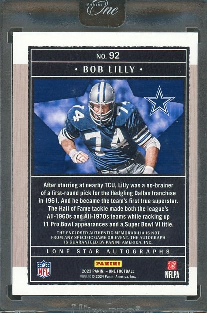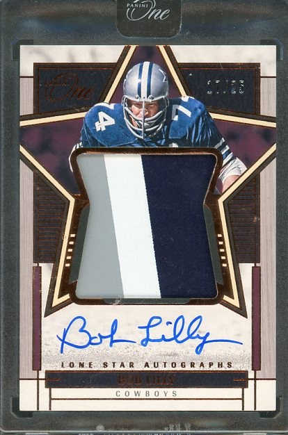 2023 Panini One Bob Lilly 3 Color Patch Autograph #'d/25 - Factory sealed by Panini. - Check out how nice the patch relic is on this limited Bob Lilly card. This great 3 Color Game Patch relic is accompanied by Lilly's autograph in blue ink across the bottom of the card. The card is serial #17/25 and is still factory sealed by Panini. A great item!
