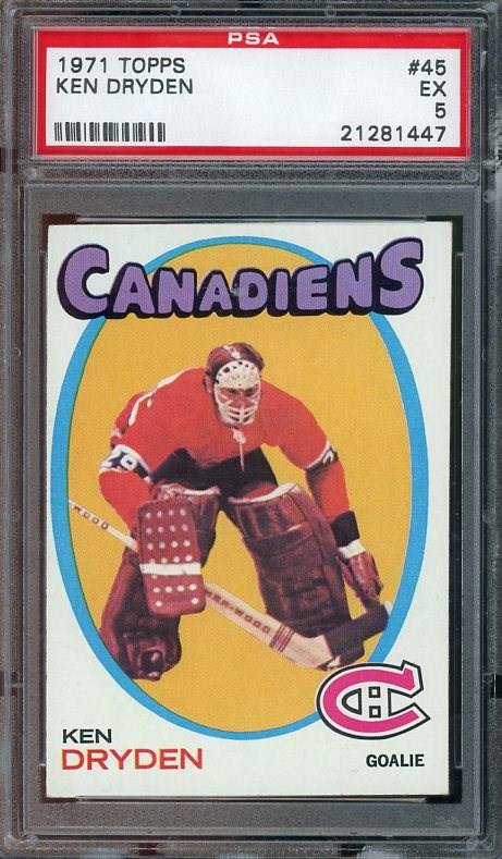 1971 Topps Ken Dryden RC #45  PSA EX 5 - Card has nice corners, color and registration, but the side to side centering is contributing to the overall grade.