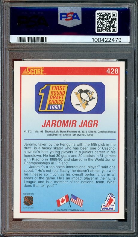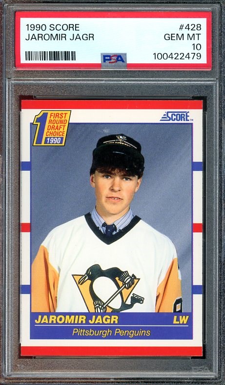 1990 Score Jaromir Jagr RC #428  PSA Gem Mint 10 - One of the all-time greats, Jagr is still playing professionally in Europe (37 seasons!).  PSA 10 in a clean PSA holder.