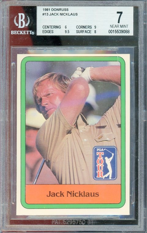 1981 Donruss Jack Nicklaus #13  BGS NM 7 - A pack fresh card with Beckett grading the corners a 9, edges 9.5, surface 8, and centering 6.  Starting bid of only $10.