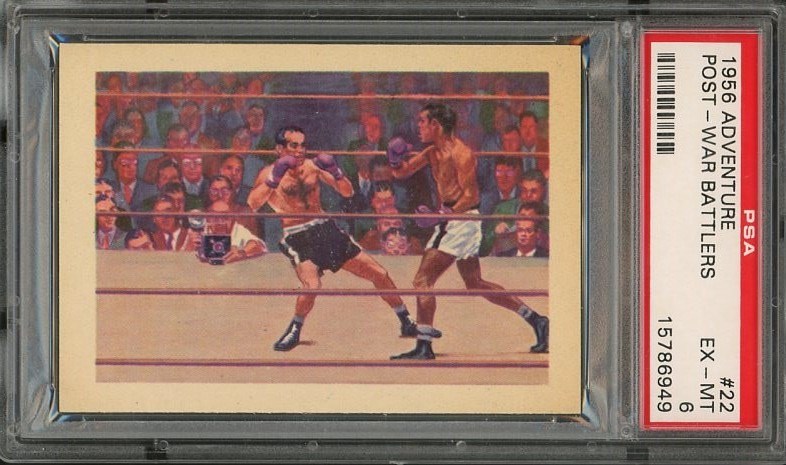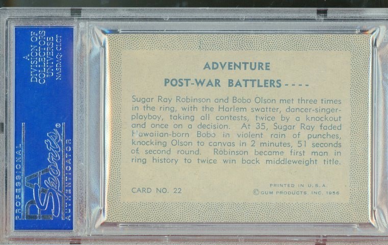 1956 Adventure Sugar Ray Robinson vs. Bobo Olson #22 PSA EX/MT 6 - Sugar Ray Robinson defeats Bobo Olson for the World Middleweight Championship. The fight went 15 rounds with Robinson winning the decision.