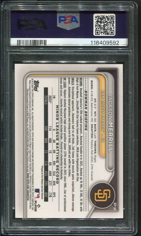 2024 Bowman Chrome Prospects Jackson Merrill Lava Refractor RC #BCP145 #'d/399 PSA Gem Mint 10 - One of the best young players in the league, Merrill was rewarded with a new nine year contract with a $135 million guarantee.