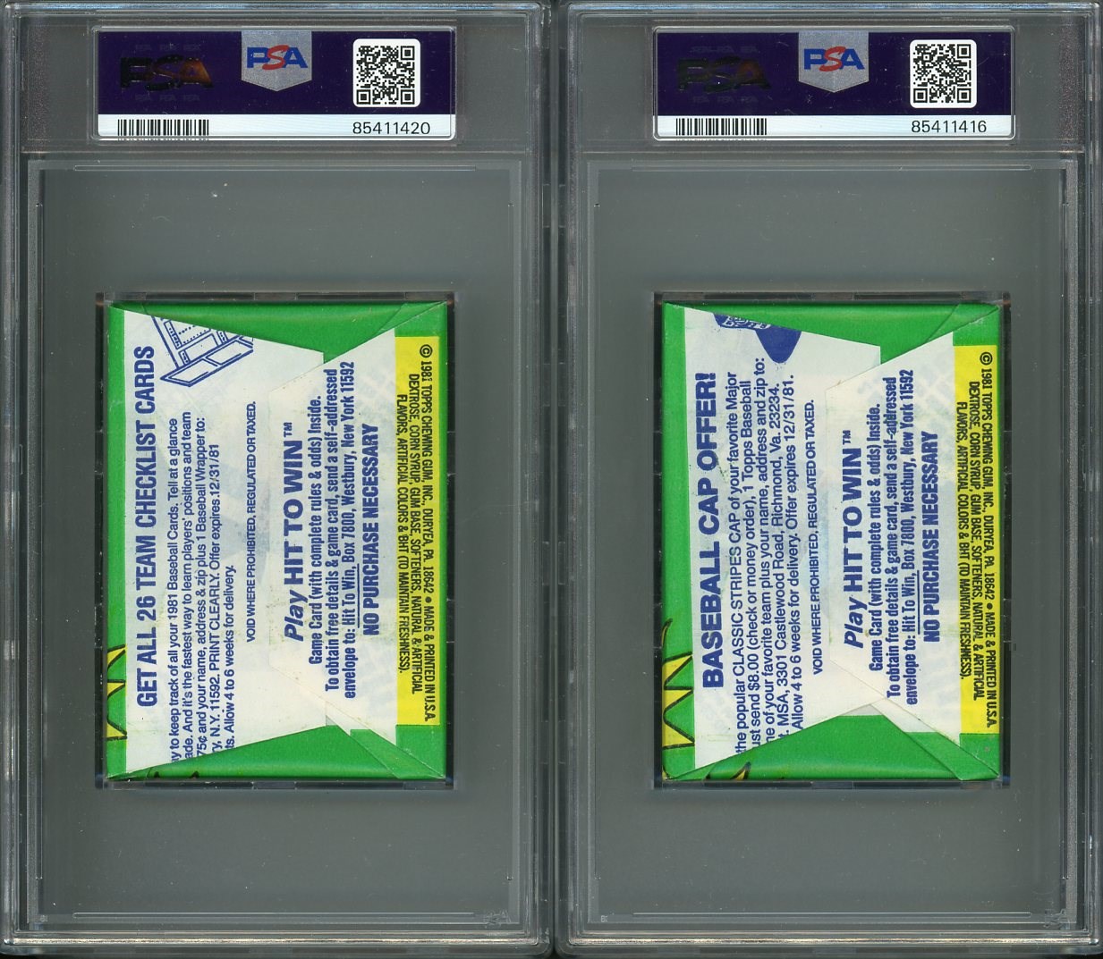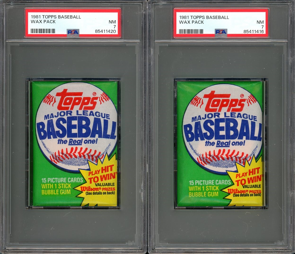 Lot of 2 1981 Topps Baseball Unopened Wax Packs PSA NM 7's - Authenticated, graded and slabbed by PSA.  Graded packs are becoming a hot commodity with collectors.  Packs have the possibility of Tim Raines, Harold Baines and Kirk Gibson rookie cards as well as a variety of Hall of Famers.