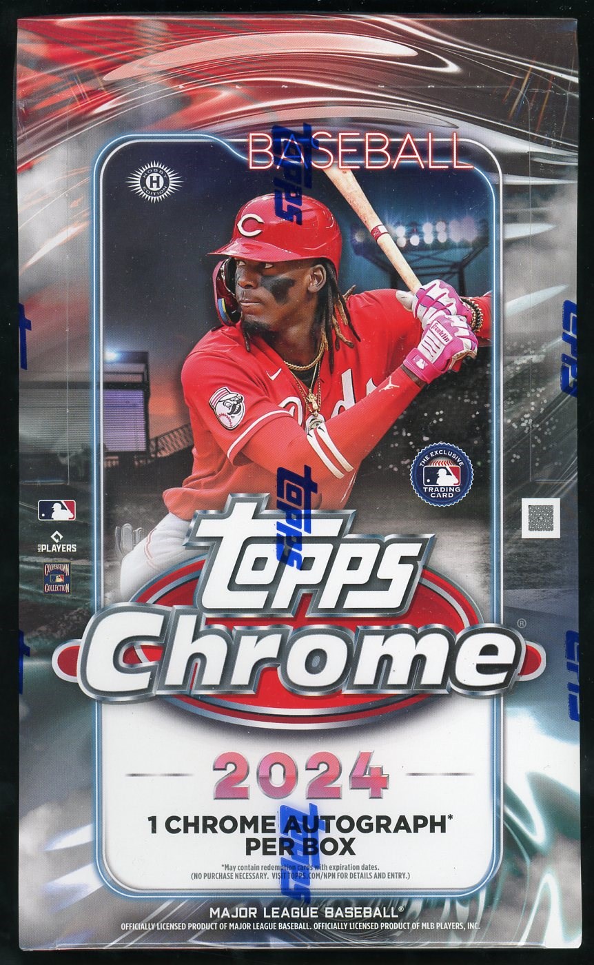 2024 Topps Chrome Baseball Unopened Hobby Box (1 Auto per box) - A super hot item! The hobby box features one autograph per box, which includes players from today, or HOFers from the past. (24 packs of 4 cards.)