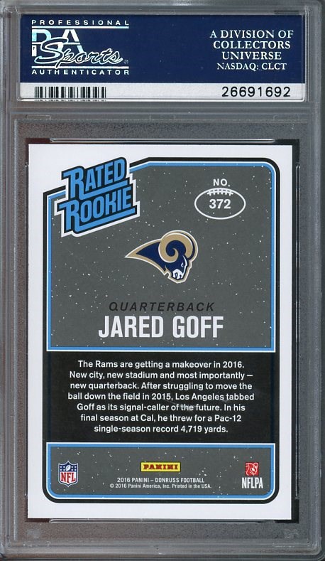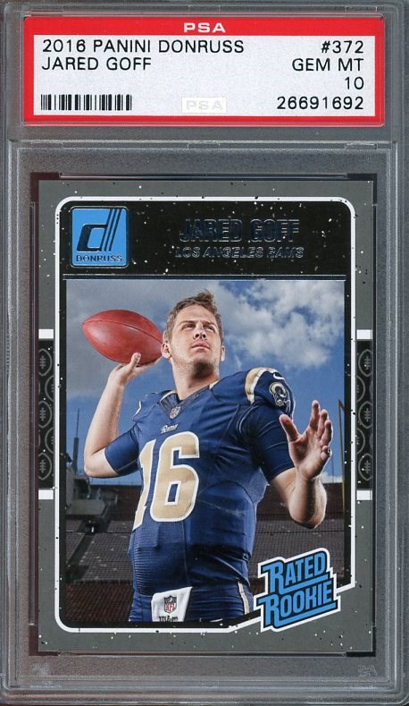 2016 Panini Donruss Jared Goff RC #372 PSA Gem Mint 10 - Goff has re-emerged as a top flight quarterback since joining the Lions. Here is his 2016 Donruss Rated Rookie in PSA Gem Mint 10 grade.