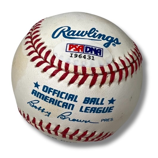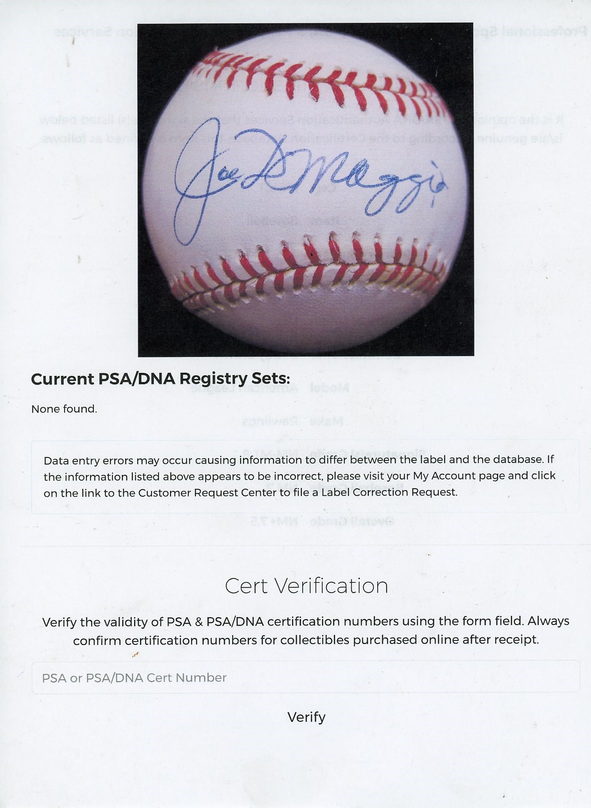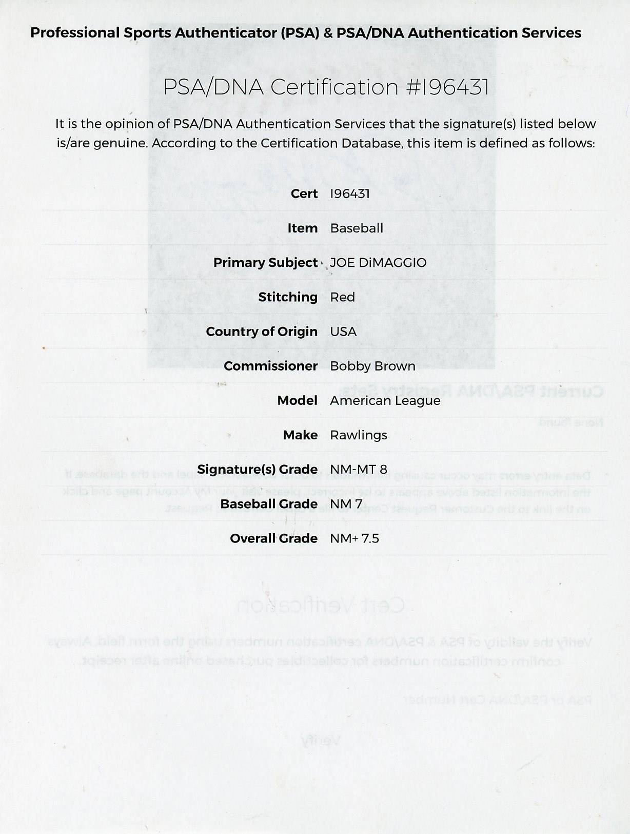 Joe DiMaggio Autographed OAL Baseball PSA/DNA NM+ 7.5 - Signed on the sweet spot of an official American League Bobby Brown, Pres. Baseball.  The autograph is authenticated by PSA/DNA and was graded a NM/MT 8 on the signature and NM 7 on the baseball.  The documentation was printed directly off of PSA's website.