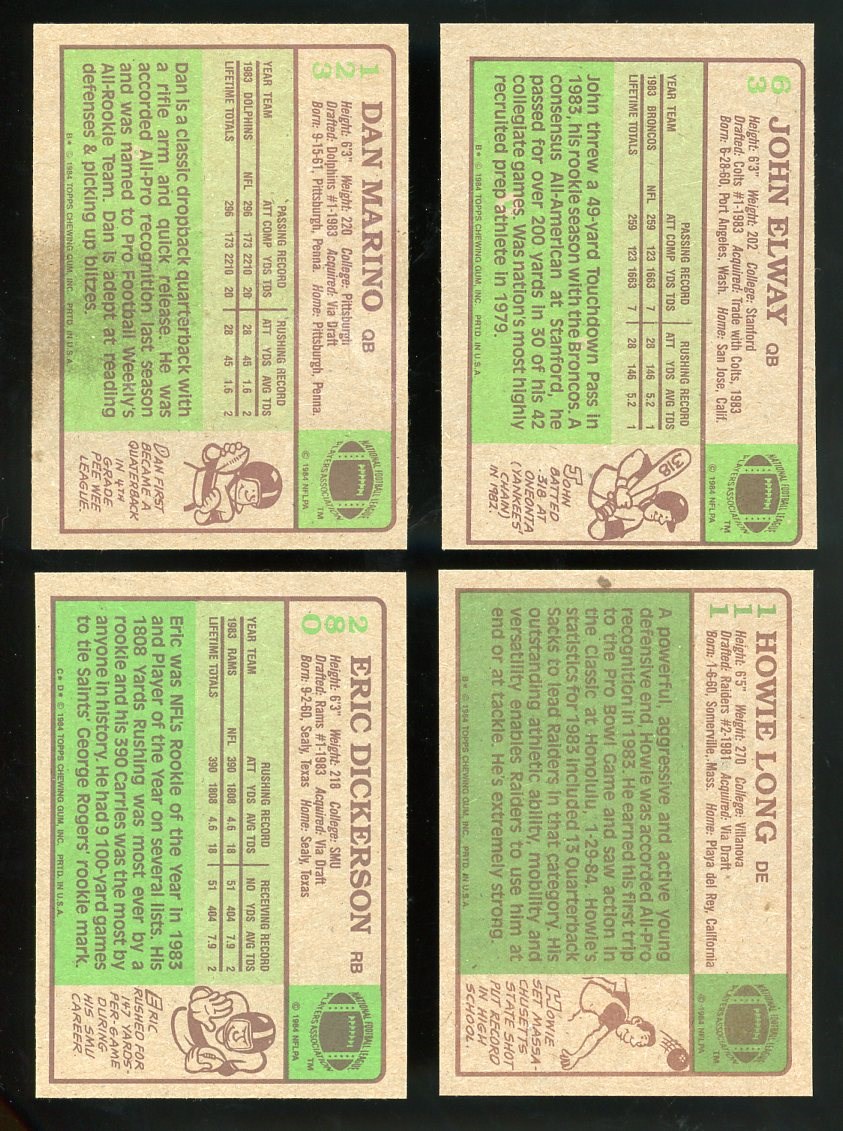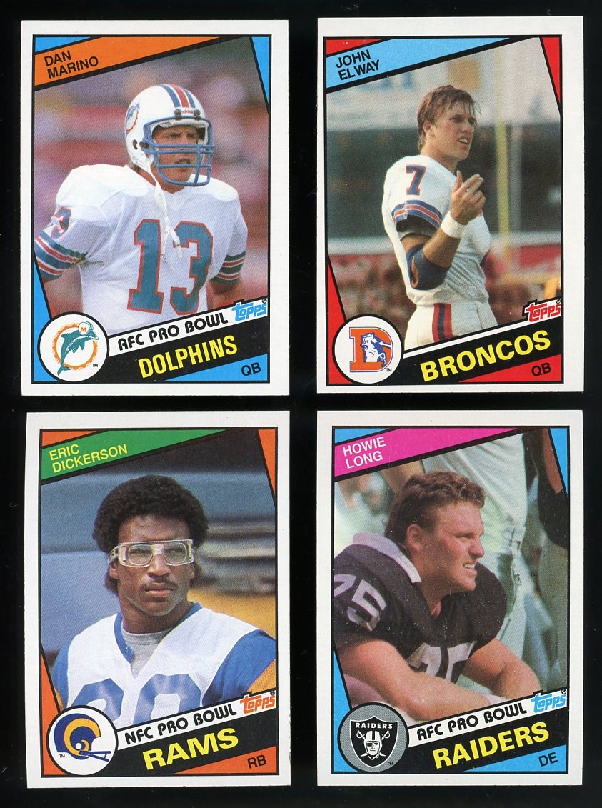 1984 Topps Football Complete Set - Mostly EX/MT to NM/MT.  Nice corners throughout with centering being the main variant of condition.  Elway is off center, but otherwise nice.  Marino is NM on the front, but has a wax stain on the back.  All other key cards are free of major defects.