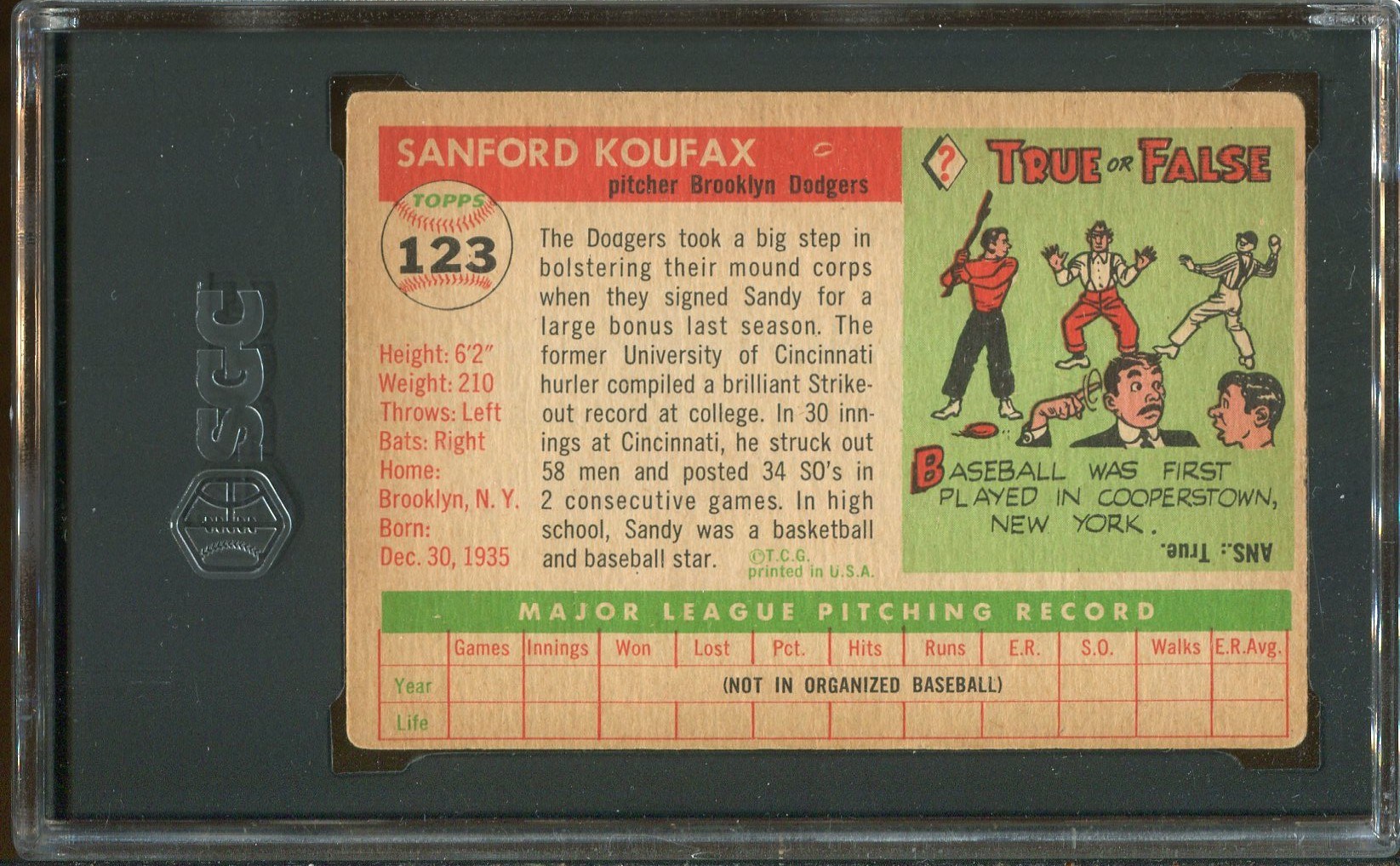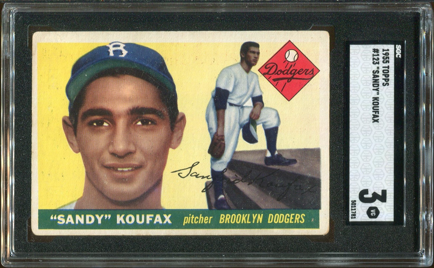 1955 Topps Sandy Koufax RC #123 SGC VG 3 - Koufax rookies have been in high demand recently as investors continue to grab up older Hall of Fame rookie cards. Here is an SGC VG 3 of Koufax with nice centering and original color. Even corner wear contributes to the overall grade.