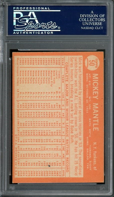 1964 Topps Mickey Mantle #50 PSA EX/MT 6 - Near perfect registration and original color highlight this 1964 Topps Mantle issue. Centering is the main factor that holds this back from a higher grade. A solid mid grade card of the Mick!