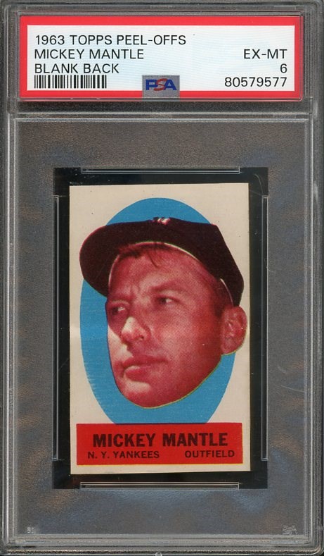 1963 Topps Peel Offs Mickey Mantle (Blank Back) PSA EX/MT 6 - Here is a really tough Mantle item to find in good shape. This is a high end PSA EX/MT 6 with great centering. This issue is incredibly tough to find centered and this card does not disappoint! These do not come up for sale in PSA 6 grade very often, so don't miss out!