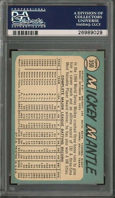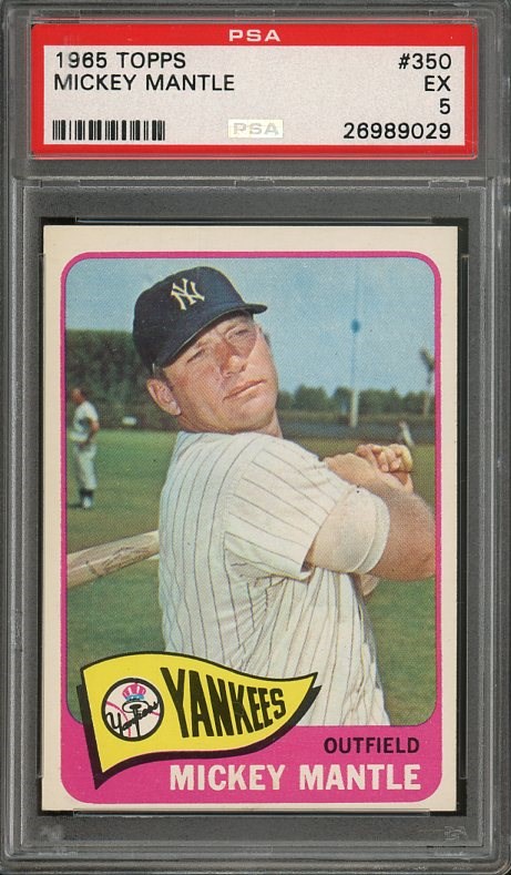 1965 Topps Mickey Mantle #350  PSA EX 5 - A sharp card of Mantle from the 1965 Topps set, this card has several near mint qualities with the exception of centering.  A clean card that comes in a clean PSA holder.
