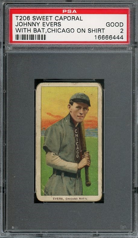 1909-11 T206 Johnny Evers (w/Bat, Chicago Shirt) PSA Good 2 - Hall of Famers, like Evers, from the T206 set have been a hot commodity over the last six months or so. Collectors are scooping up any T206's that present a good value. Here is Evers, with bat, in Chicago uniform graded PSA 2. Card comes in a scratch free PSA holder.