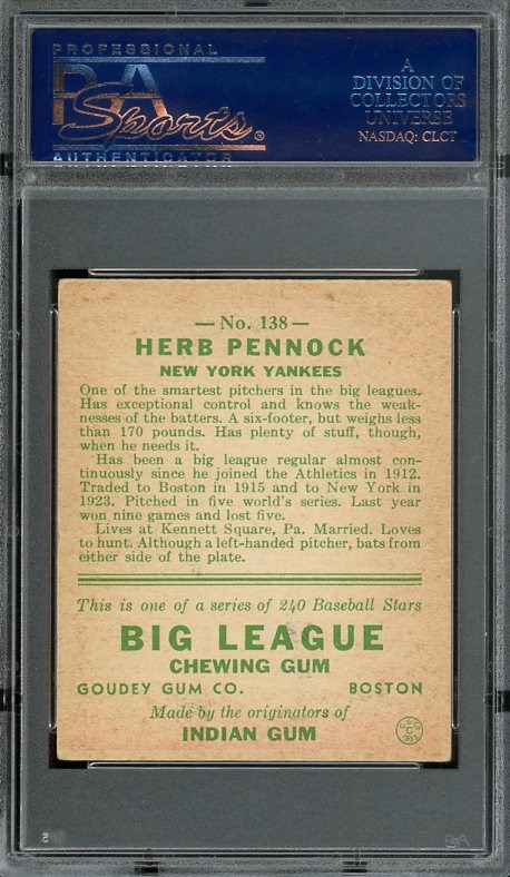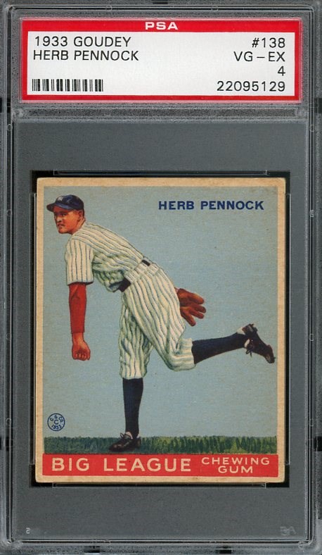 1933 Goudey Herb Pennock #138 PSA VG/EX 4 - This PSA 4 of Pennock has exceptional centering which contributes to it's great overall eye appeal. Even corner wear is all that holds this beauty back from a higher grade. A solid card that would fit nicely in a mid-grade 1933 set.