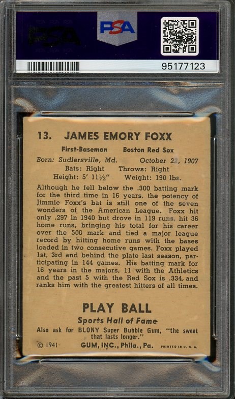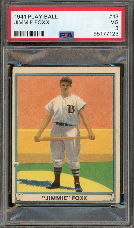 1941 Play Ball Jimmy Foxx #13 PSA VG 3 - A popular player with vintage collectors, Foxx cards continue to catch the attention of investors looking for good value in the market. This PSA 3 was graded about a 12-18 months ago and comes in a new PSA holder.