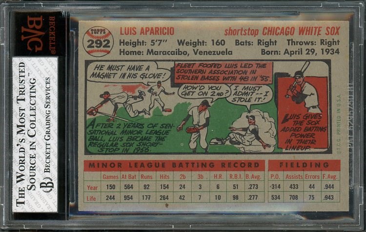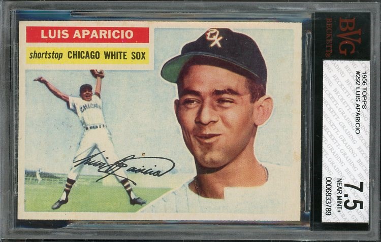 1956 Topps Luis Aparicio RC #292 BVG NM+ 7.5 - Aparicio was one of the key rookie cards in the 1956 Topps set. Here is a high grade example to add to your collection. Graded NM+ 7.5 by Beckett, this card has nice centering, color and registration.