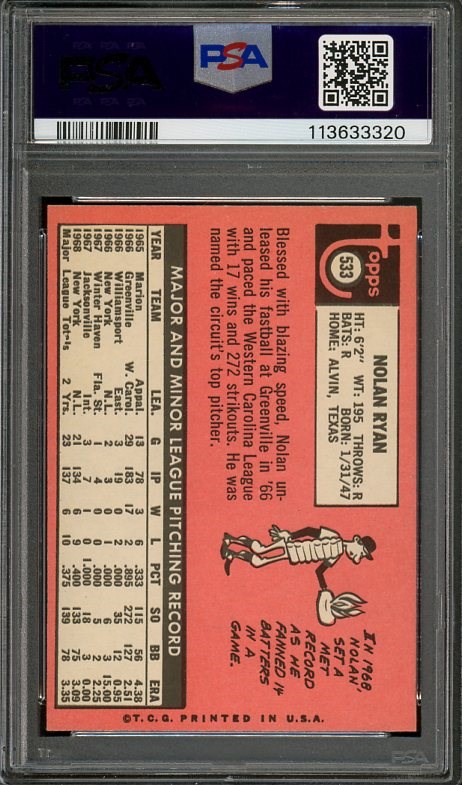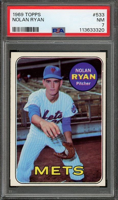 1969 Topps Nolan Ryan #533  PSA NM 7 - Ryan emerged in 1969 as a major contributor the the "Amazing Mets" 1969 Championship team.  This colorful second year card of Ryan has great corners and is very deserving of the Near Mint 7 grade issued by PSA.  Card was recently graded and comes in a new PSA holder.