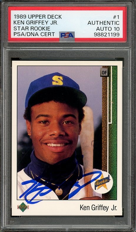 1989 Upper Deck Ken Griffey, Jr #1 Autographed with PSA 10 Auto Grade - Perfect centering and a bold, blue sharpie signature by Griffey, highlight this special lot.  This is by far Griffey, Jr's best rookie card and the autograph makes this one extra special.  Don't let this one get away!