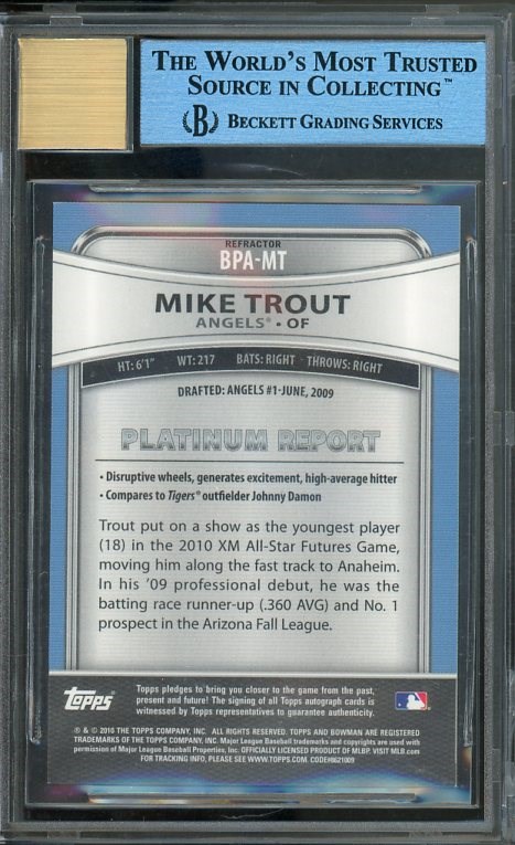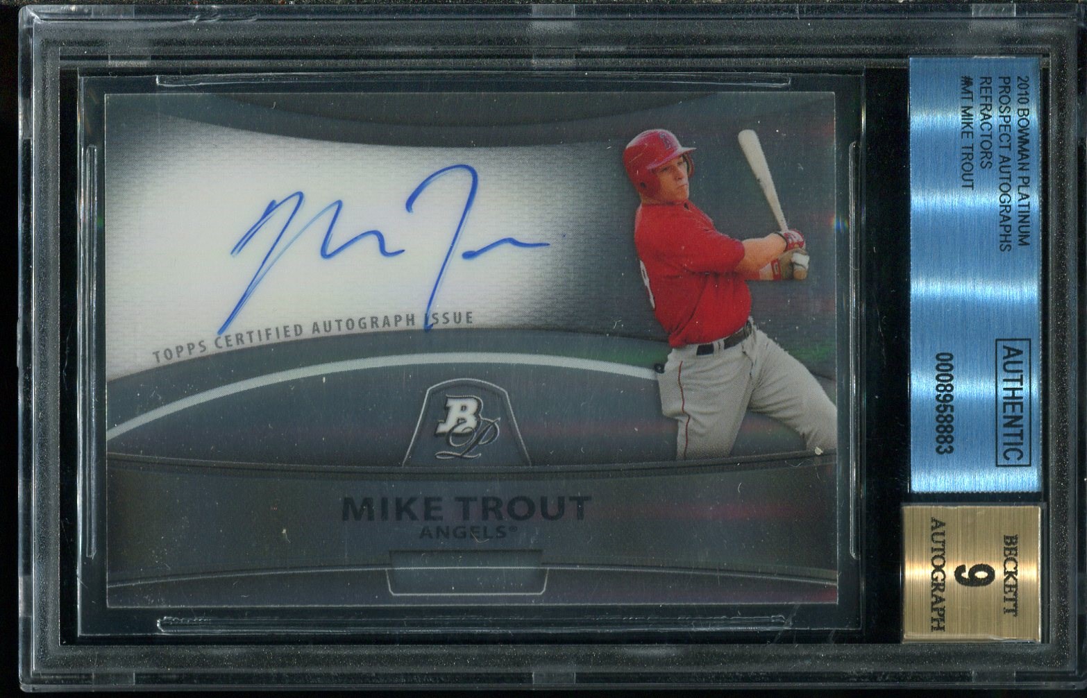 2010 Bowman Platinum Mike Trout Refractor Autograph #MT with BGS 9 Auto Grade - Here is one of Trout's most sought after rookie autographs, the 2010 Bowman Platinum Refractor Autograph. Card is problem free and was given a Mint 9 autograph grade by Beckett.