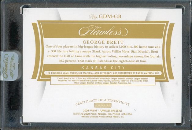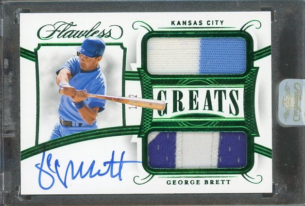 2020 Panini Flawless George Brett Dual, 2 Color Patch Autograph Emerald #1/2 - Two great patches highlight this special Brett issue.  In addition to the two premium patches, the card features an beautiful, on card signature by Brett.  Serial number 1 of 2 made, this is a rare piece to own!  Card is still in the original factory sealed case issued by Panini.