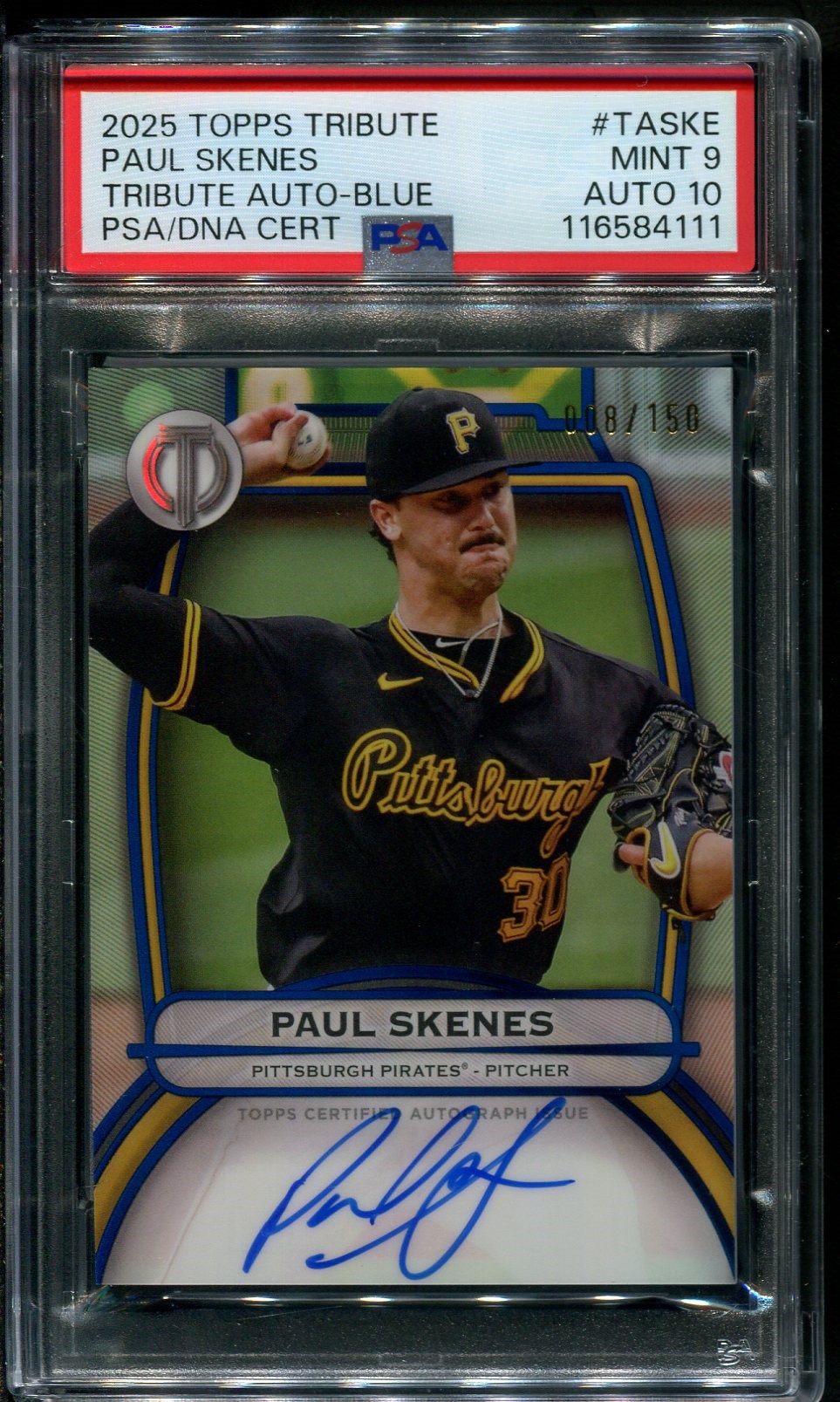 2025 Topps Tribute Paul Skenes Autograph Blue #'d/150 PSA 9 with PSA 10 Autograph.  This beauty features a great in action photo of Skenes with a Gem Mint autograph across the bottom of the card.  This high grade Skenes should get a lot of attention with it's PSA 9 card grade and Gem Mint 10 autograph grade.  The card is serial numbered out of 150 produced and comes in a new PSA holder.