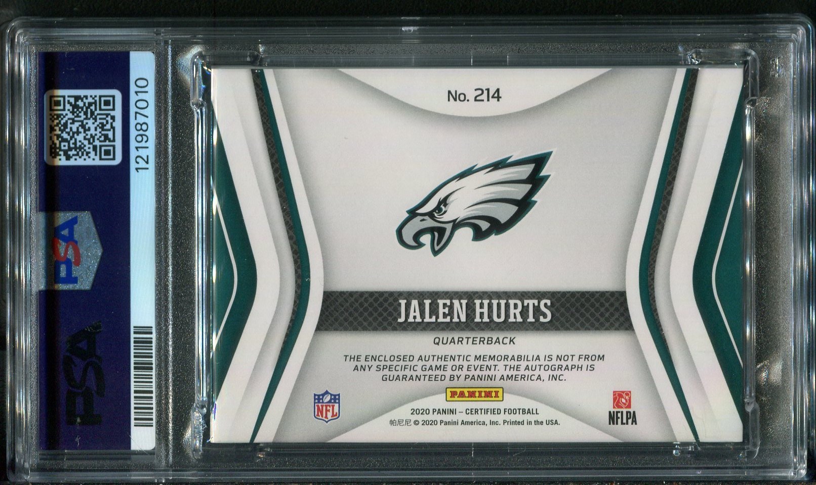 2020 Panini Certified Jalen Hurts 3 Color Patch Autograph RC #214 Blue #'d/99 PSA 7 with PSA 10 Auto - A great three-color patch accompanies Hurts' autograph on this limited Panini issue. The blue ink autograph matches nicely to the Panini "Mirror Blue" design, making this an attractive Hurts to own. Limited to 99 made, this card was recently graded and comes in a new PSA holder.