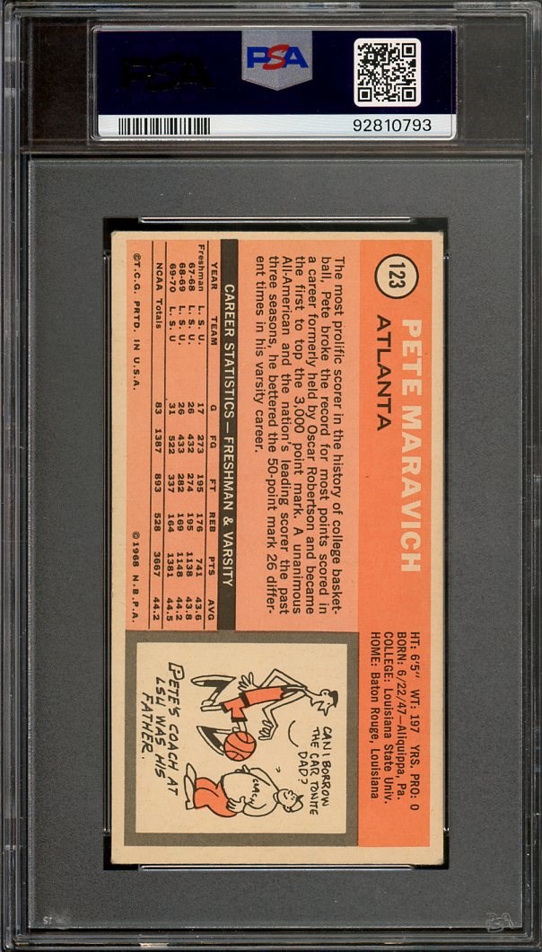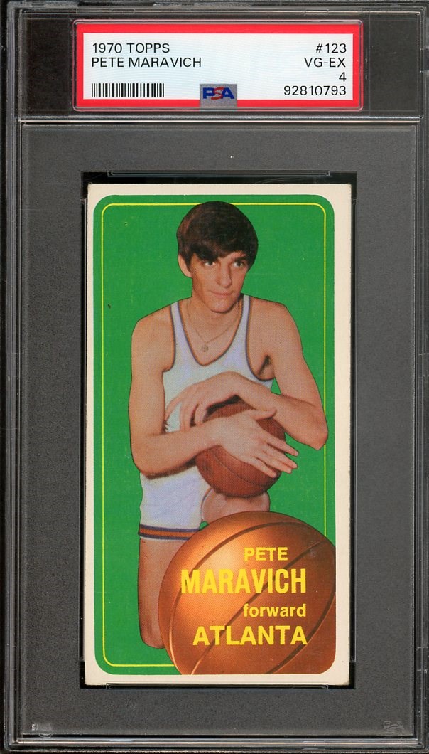 1970 Topps Pete Maravich RC #123 PSA VG/EX 4 - Card looks really nice for the grade and comes in a new PSA holder. Maravich rookies are highly sought after as they are getting grabbed up by investors. Don't miss out on this one!