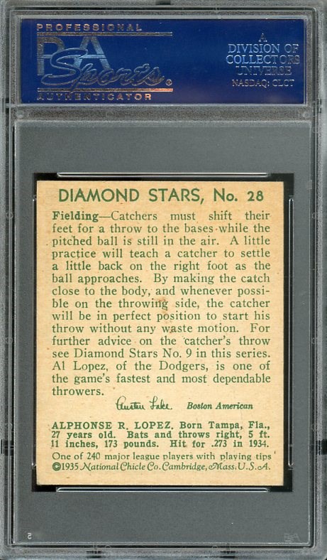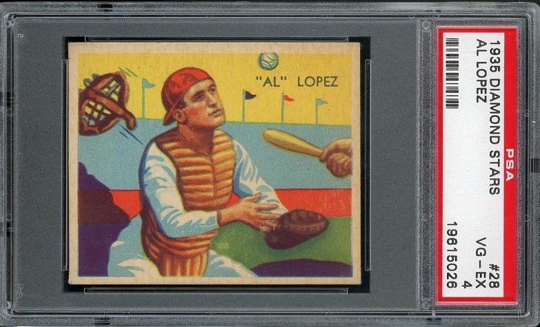 1935 Diamond Stars Al Lopez #28  PSA VG/EX 4 - A very nice PSA 4 with no creases, great centering and registration.  Corner wear in the lower left contributes to the overall grade.