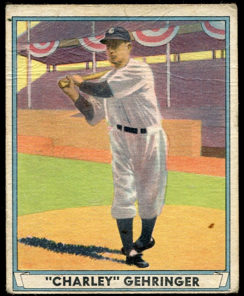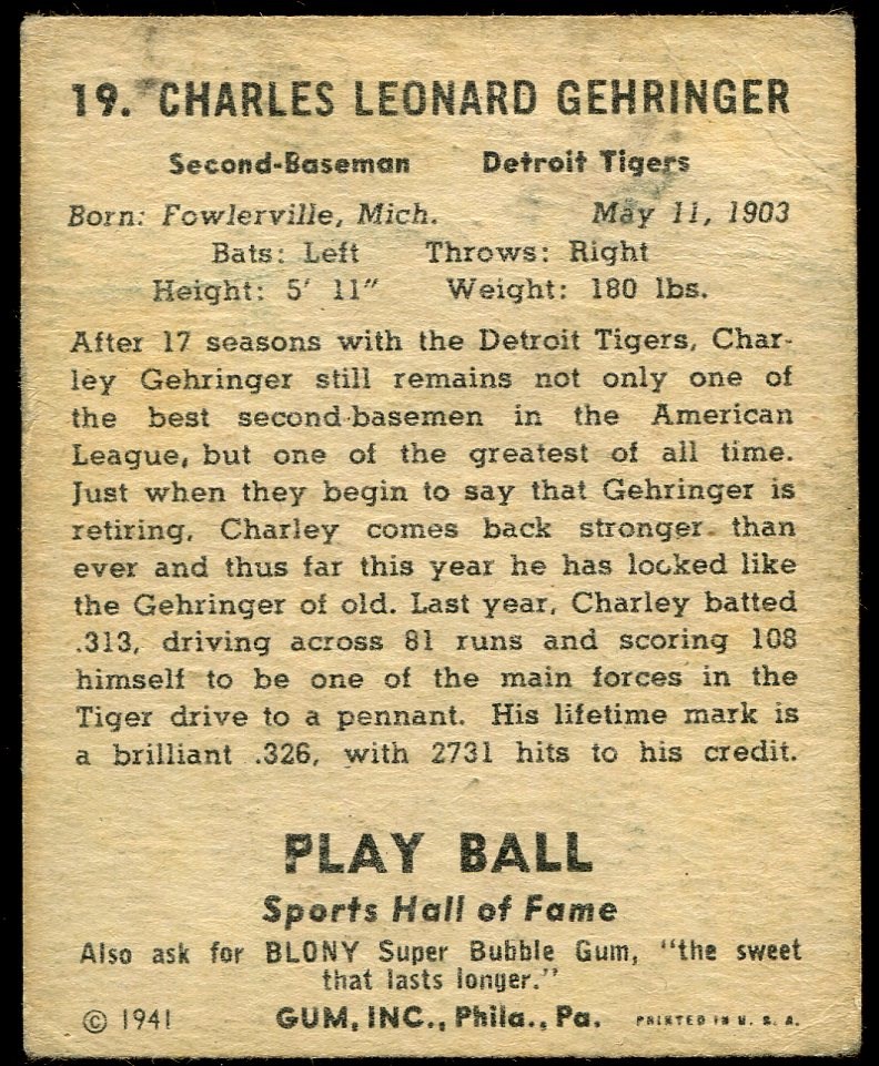 1941 Play Ball Charlie Gehringer #19 - For the collector, here is an original 1941 Play Ball card of HOFer Charlie Gehringer.  Card has major creasing in the top half of the card as well as corner wear.  Starting bid is $40 for this 84 year old card.