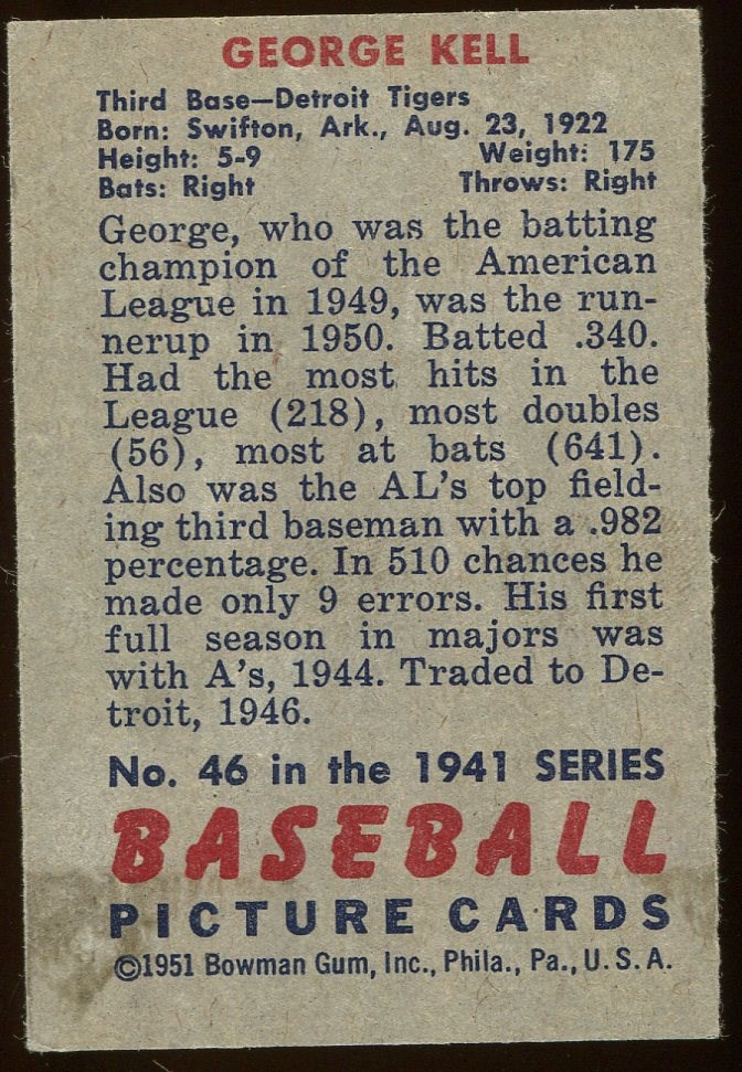 1951 Bowman George Kell #46 - A solid VG/EX card free of major flaws, this 1951 Bowman Kell would fit nicely in a mid-grade set.  Card has mild corner wear and a light wax stain on the back.