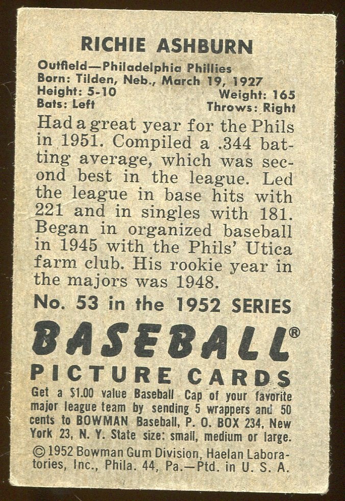 Lot # 58: 1952 Bowman Richie Ashburn #53