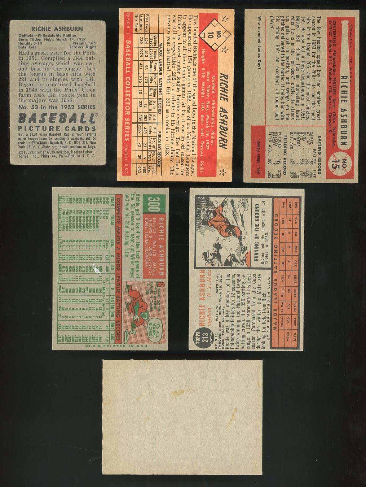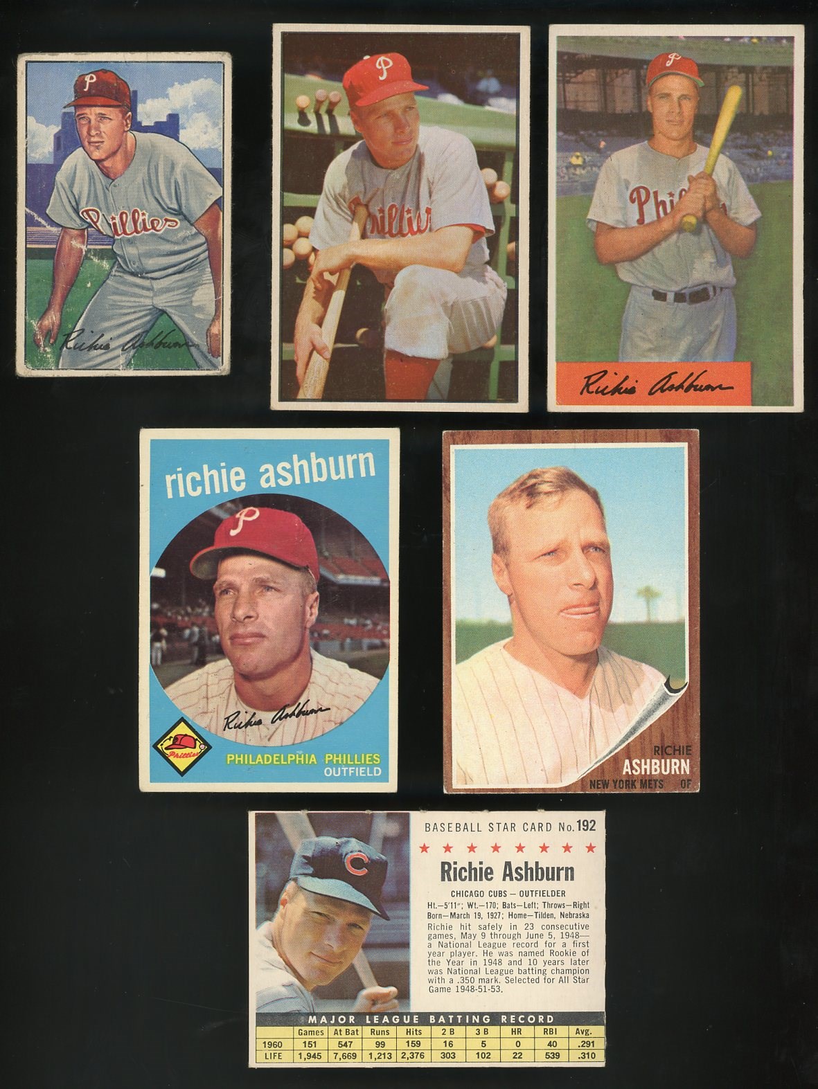 Richie Ashburn Lot of 6 Different 1950's-60's - Includes his 1952 Bowman #53 (Fair-Poor), 1953 Bowman #10 (VG), 1954 Bowman #15 (VG), 1959 Topps #300 (VG/EX), 1962 Topps #213 (VG/EX), 1961 Post Cereal #192 (EX).