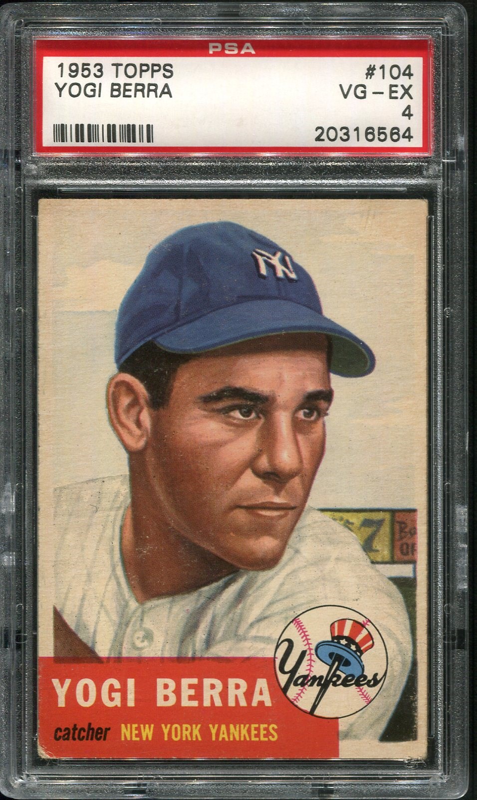 1953 Topps Yogi Berra #104  PSA VG/EX 4  - A tough card with great eye appeal.  Card is crease free with enough corner wear to receive a PSA VG/EX 4 grade.