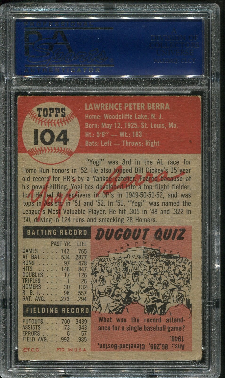 Lot # 68: 1953 Topps Yogi Berra #104 PSA VG/EX 4