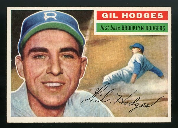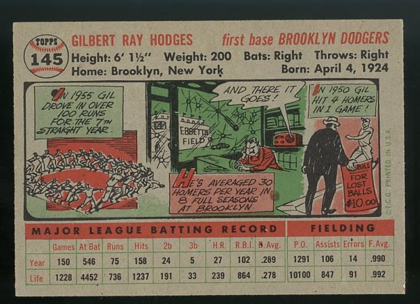 1956 Topps Gil Hodges #145 - This 1956 Hodges is a solid mid-grade card with great registration, original color, and nice centering.  Some light corner wear makes this one EX condition.