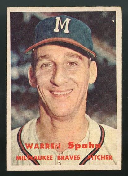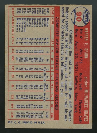 1957 Topps Warren Spahn #90 - Card has some surface wear in the upper right quadrant, plus corner wear which contributes to the VG grade.