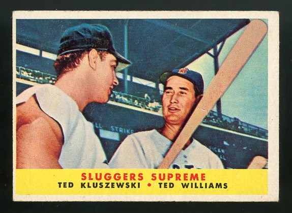 1958 Topps Sluggers Supreme with Ted Williams and Ted Kluszewski #321 - This Sluggers Supreme featuring Ted Williams is free of major defects, with corner wear and centering issues that contribute to the VG/EX grade.
