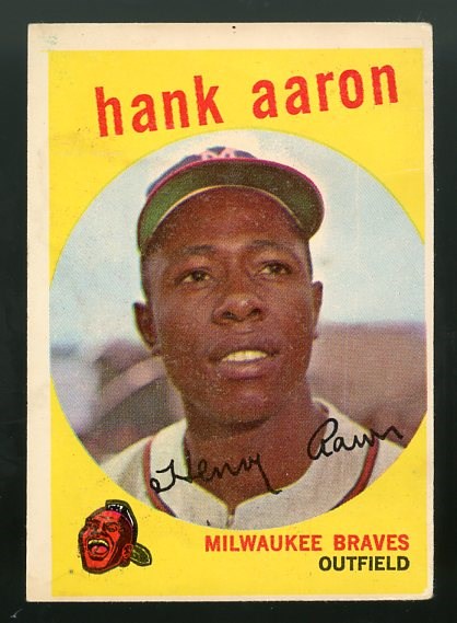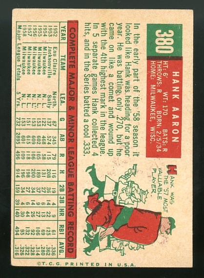 1959 Topps Hank Aaron #380 - Card has some short creases coming off the right border as well as corner wear.  This one would still go nicely in a lower grade set as it is not abused.  Overall grade is Good