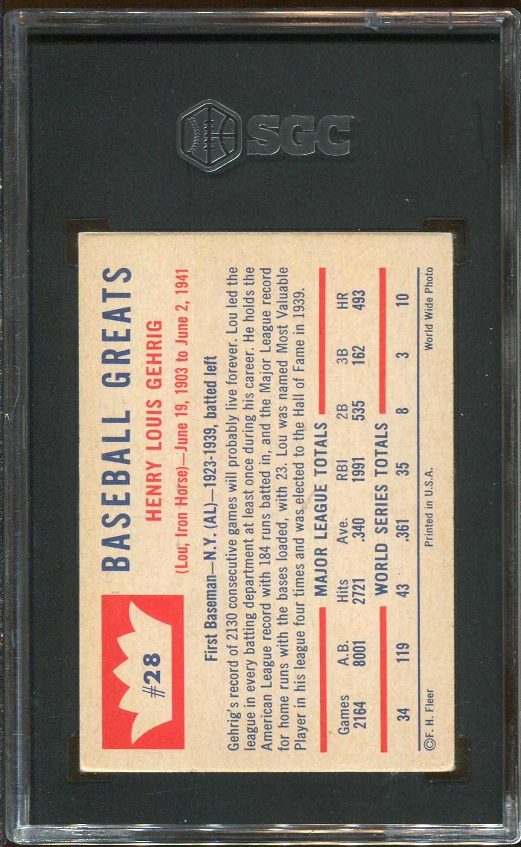 Lot # 95: 1960 Fleer Lou Gehrig #28 SGC EX/MT 6