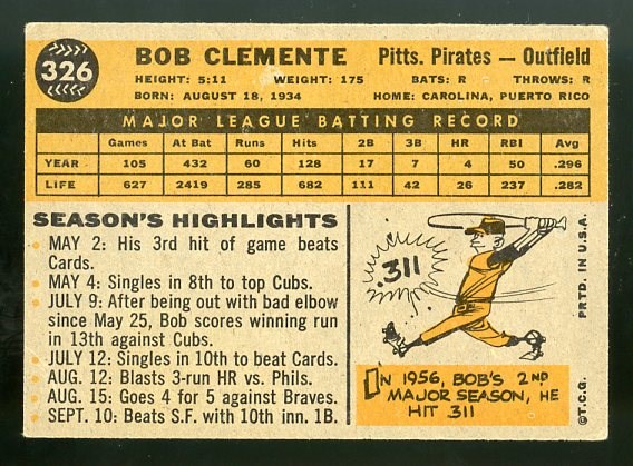 1960 Topps Roberto Clemente #326 - Card has several nice qualities with 60/40 centering and nice color, but there is a small crease visible when held at an angle.  Great eye appeal for the technical grade of VG.