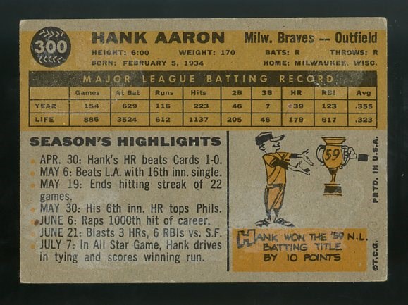 1960 Topps Hank Aaron #300 - This 1960 Topps Aaron card is often off center, but this example is an exception.  The card does have corner wear and on the reverse, has some light discoloration.  Card is Good to VG overall.