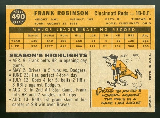 1960 Topps Frank Robinson #490 - A very nice card with great centering and corners. Overall grade EX/MT or better.