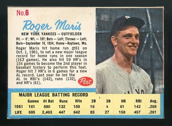 1962 Post Cereal Roger Maris #6 - Card is crease free with corner wear contributing to the VG/EX grade.