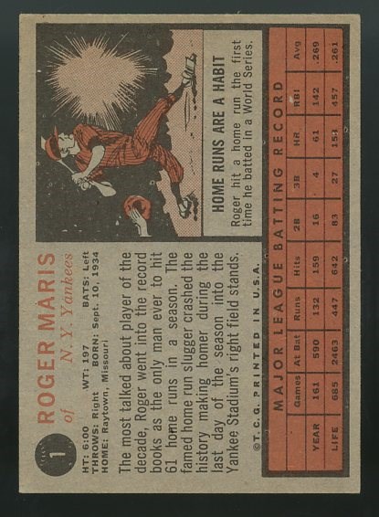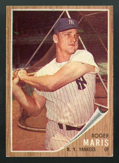1962 Topps Roger Maris #1 - This 1962 Topps Maris is often off center, but this mid-grade example has centering as one of it's strong features. Card has nice color and registration with mild corner wear that is so typical on the 1962 Topps design. Overall VG/EX+ with no major flaws.