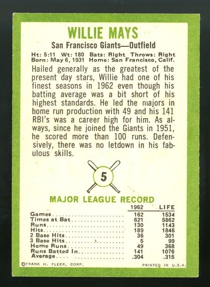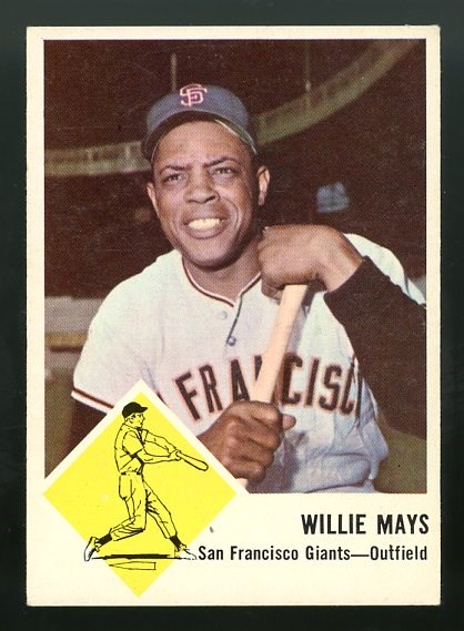 1963 Fleer Willie Mays #5 - This Mays issue by Fleer has excellent centering and color, but does have some soft corners and a small crease by his name.  Overall grade is VG