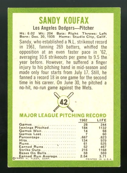 1963 Fleer Sandy Koufax #42 - This 1963 Fleer Koufax has great color, 60/40 centering, with corner wear and a small corner crease in the upper left corner. Overall VG.